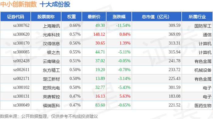 中小创新(399015)指数十大成份股详情如下: