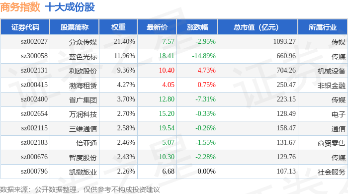 商务指数(399242)十大成份股详情如下: