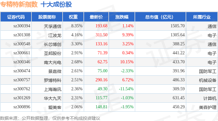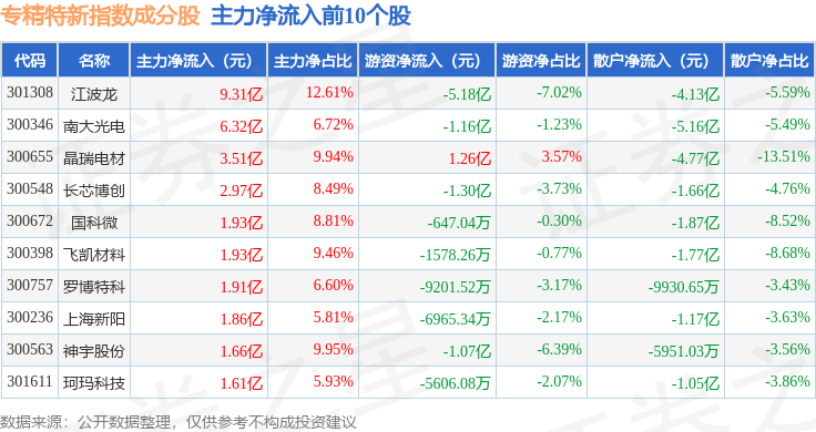 资金流向方面,专精特新(399267)指数成份股当日主力资金净流出合计2.45亿元,游资资金净流出合计2.85亿元,散户资金净流入合计5.3亿元。成份股资金流向详情见下表: