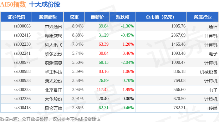 资金流向方面,AI50(399284)指数成份股当日主力资金净流出合计54.59亿元,游资资金净流入合计9.51亿元,散户资金净流入合计45.08亿元。成份股资金流向详情见下表: