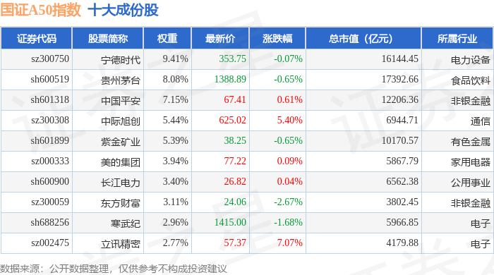 国证A50(399310)指数十大成份股详情如下: