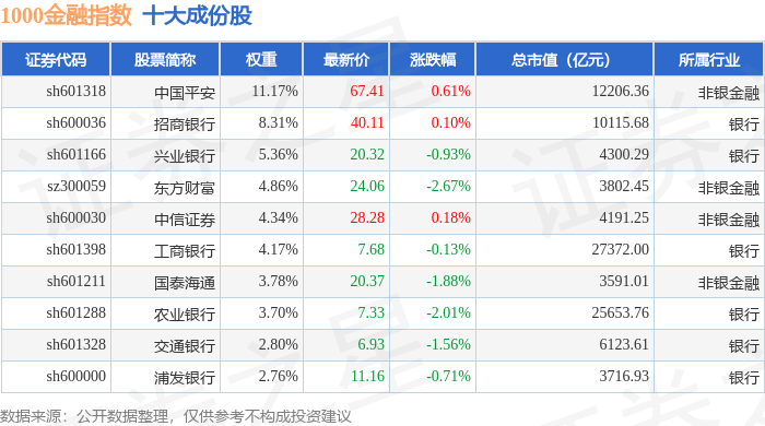 1000金融(399387)指数十大成份股详情如下: