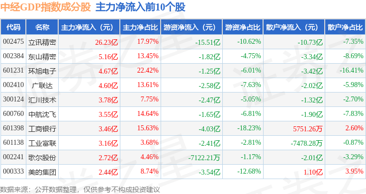 资金流向方面,中经GDP(399399)指数成份股当日主力资金净流出合计49.33亿元,游资资金净流出合计8.86亿元,散户资金净流入合计58.19亿元。成份股资金流向详情见下表: