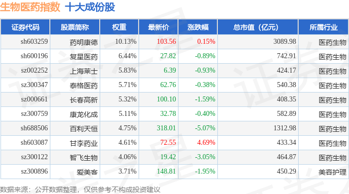 生物医药(399441)指数十大成份股详情如下: