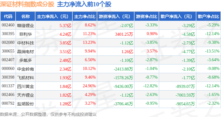 资金流向方面,深证材料(399614)指数成份股当日主力资金净流入合计20.96亿元,游资资金净流出合计9.64亿元,散户资金净流出合计11.32亿元。成份股资金流向详情见下表: