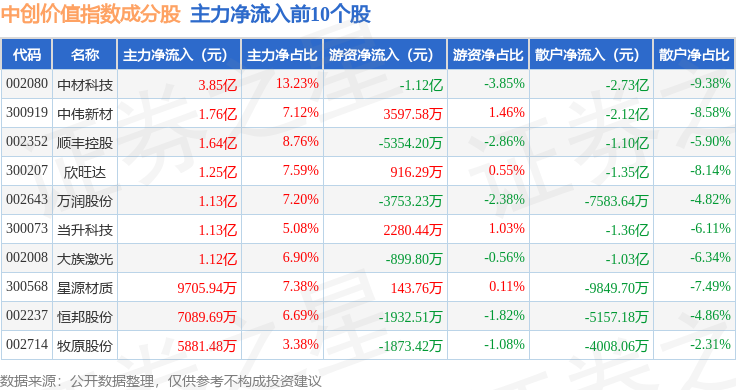 资金流向方面,中创价值(399627)指数成份股当日主力资金净流出合计42.21亿元,游资资金净流入合计8.95亿元,散户资金净流入合计33.25亿元。成份股资金流向详情见下表: