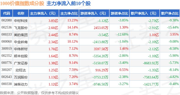 资金流向方面,1000价值(399631)指数成份股当日主力资金净流出合计50.55亿元,游资资金净流入合计10.54亿元,散户资金净流入合计40.0亿元。成份股资金流向详情见下表: