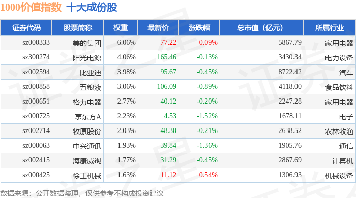 1000价值(399631)指数十大成份股详情如下: