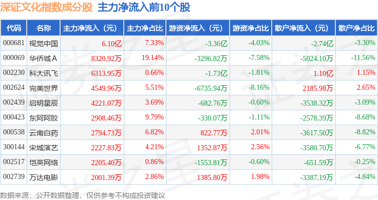 资金流向方面,深证文化(399654)指数成份股当日主力资金净流出合计122.51亿元,游资资金净流入合计15.65亿元,散户资金净流入合计106.86亿元。成份股资金流向详情见下表: