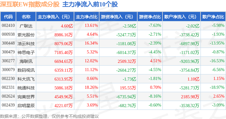 资金流向方面,深互联EW(399677)指数成份股当日主力资金净流出合计160.7亿元,游资资金净流入合计31.99亿元,散户资金净流入合计128.71亿元。成份股资金流向详情见下表: