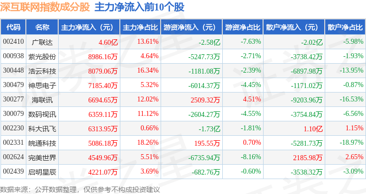 资金流向方面,深互联网(399675)指数成份股当日主力资金净流出合计160.7亿元,游资资金净流入合计31.99亿元,散户资金净流入合计128.71亿元。成份股资金流向详情见下表: