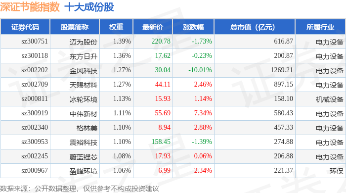 证券之星消息,1月15日,深证节能(399695)指数报收于3090.85点,涨1.07%,成交1513.7亿元,换手率2.77%。当日该指数成份股中,上涨的有65家,海力风电以10.78%的涨幅领涨,下跌的有35家,金风科技以10.01%的跌幅领跌。