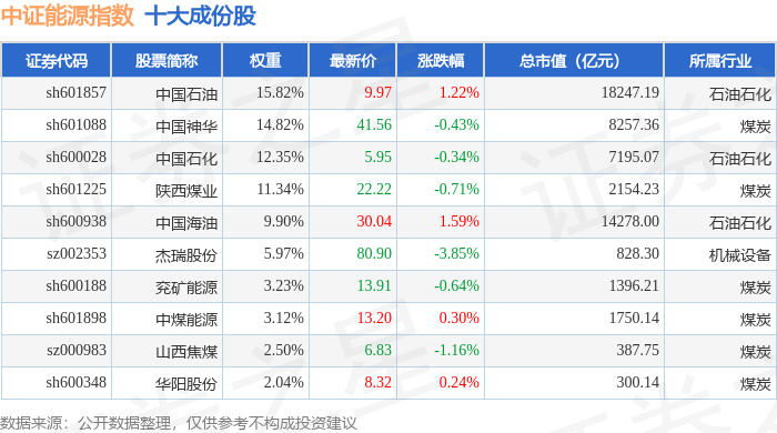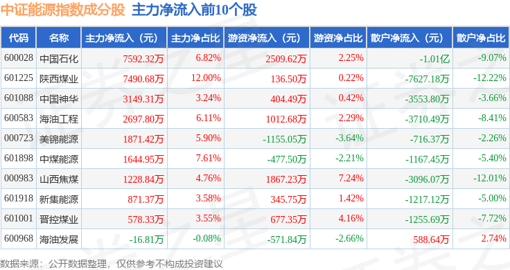 资金流向方面,中证能源(399928)指数成份股当日主力资金净流出合计2.74亿元,游资资金净流入合计2.99亿元,散户资金净流出合计2441.13万元。成份股资金流向详情见下表: