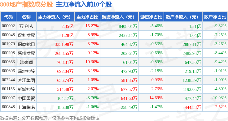 资金流向方面,800地产(399965)指数成份股当日主力资金净流入合计2.45亿元,游资资金净流出合计3660.23万元,散户资金净流出合计2.09亿元。成份股资金流向详情见下表: