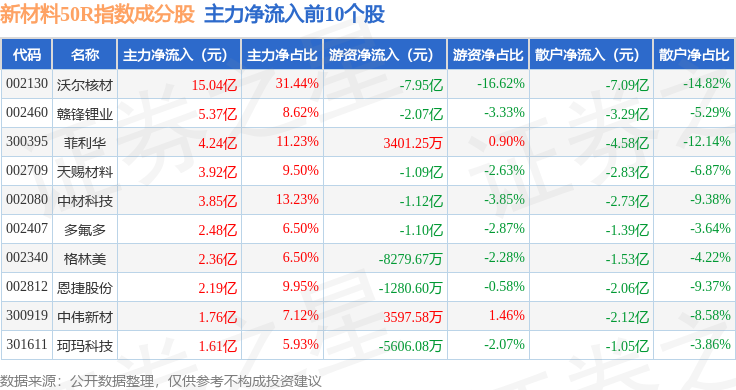 资金流向方面,新材料50R(470042)指数成份股当日主力资金净流入合计26.28亿元,游资资金净流出合计8.1亿元,散户资金净流出合计18.18亿元。成份股资金流向详情见下表: