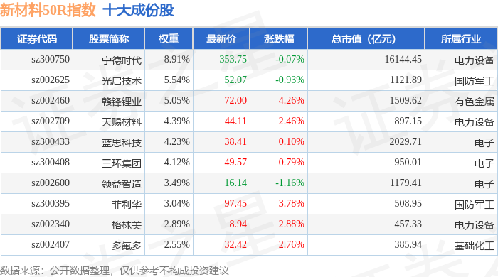 新材料50R(470042)指数十大成份股详情如下:
