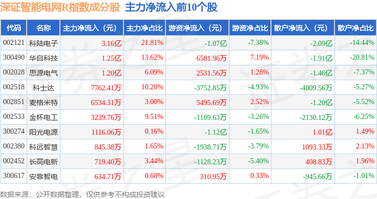 资金流向方面,深证智能电网R(470054)指数成份股当日主力资金净流出合计7.32亿元,游资资金净流出合计1.08亿元,散户资金净流入合计8.4亿元。成份股资金流向详情见下表: