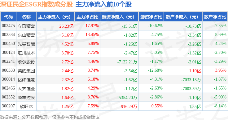 资金流向方面,深证民企ESGR(470056)指数成份股当日主力资金净流入合计23.66亿元,游资资金净流出合计24.37亿元,散户资金净流入合计7051.3万元。成份股资金流向详情见下表: