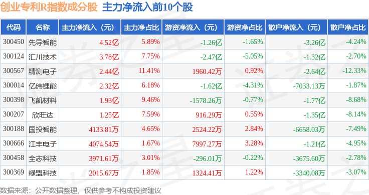 资金流向方面,创业专利R(470068)指数成份股当日主力资金净流出合计14.57亿元,游资资金净流入合计1.32亿元,散户资金净流入合计13.25亿元。成份股资金流向详情见下表: