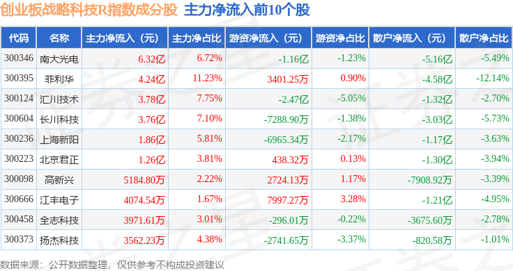 资金流向方面,创业板战略科技R(471004)指数成份股当日主力资金净流出合计10.13亿元,游资资金净流入合计1.54亿元,散户资金净流入合计8.6亿元。成份股资金流向详情见下表: