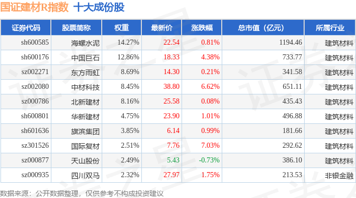 证券之星消息,1月15日,国证建材R(480048)指数报收于7421.58点,涨1.53%,成交175.49亿元,换手率3.67%。当日该指数成份股中,上涨的有19家,中旗新材以10.0%的涨幅领涨,下跌的有10家,金隅集团以9.83%的跌幅领跌。