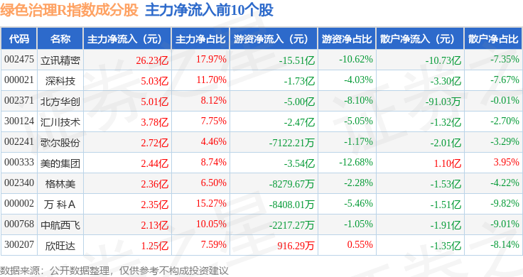 资金流向方面,绿色治理R(480058)指数成份股当日主力资金净流出合计11.12亿元,游资资金净流出合计17.32亿元,散户资金净流入合计28.44亿元。成份股资金流向详情见下表:
