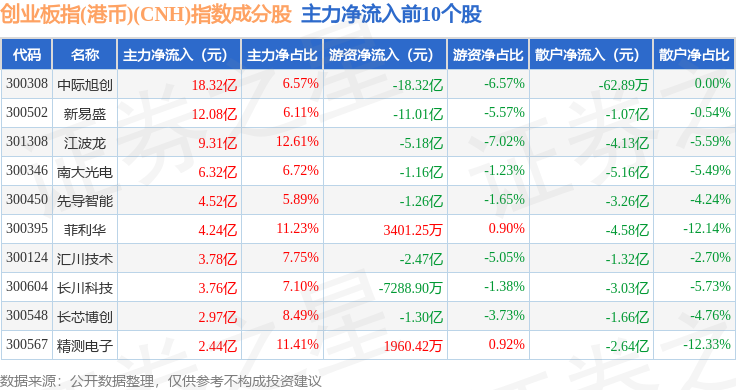 资金流向方面,创业板指(港币)(CNH)(970006)指数成份股当日主力资金净流出合计54.97亿元,游资资金净流出合计9.35亿元,散户资金净流入合计64.32亿元。成份股资金流向详情见下表: