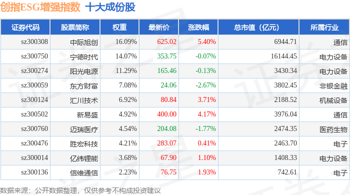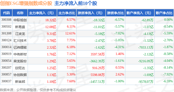 资金流向方面,创指ESG增强(970034)指数成份股当日主力资金净流入合计14.96亿元,游资资金净流出合计33.5亿元,散户资金净流入合计18.54亿元。成份股资金流向详情见下表: