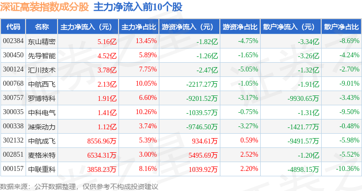资金流向方面,深证高装(970037)指数成份股当日主力资金净流出合计19.07亿元,游资资金净流出合计4.55亿元,散户资金净流入合计23.62亿元。成份股资金流向详情见下表: