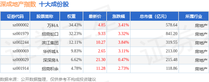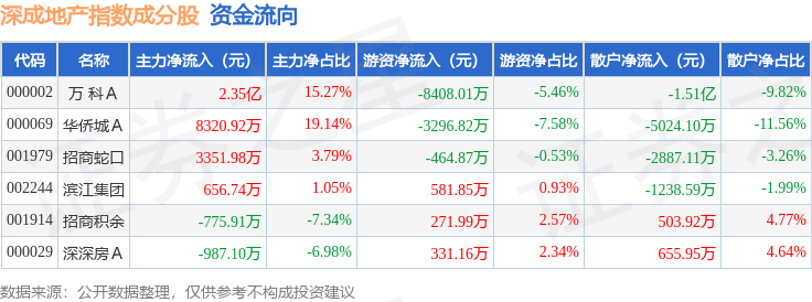资金流向方面,深成地产(971001)指数成份股当日主力资金净流入合计3.41亿元,游资资金净流出合计1.1亿元,散户资金净流出合计2.31亿元。成份股资金流向详情见下表: