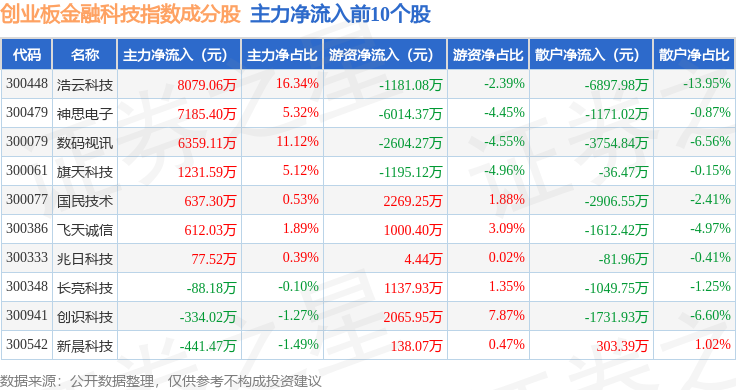 资金流向方面,创业板金融科技(970085)指数成份股当日主力资金净流出合计64.83亿元,游资资金净流入合计18.42亿元,散户资金净流入合计46.41亿元。成份股资金流向详情见下表: