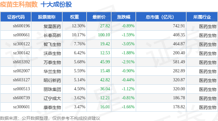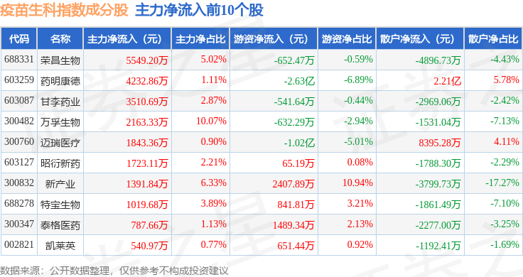 资金流向方面,疫苗生科(980015)指数成份股当日主力资金净流出合计16.03亿元,游资资金净流出合计2972.79万元,散户资金净流入合计16.33亿元。成份股资金流向详情见下表: