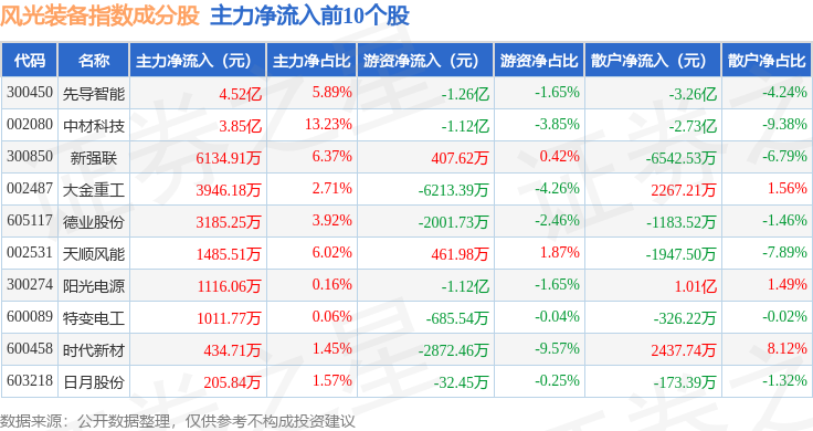 资金流向方面,风光装备(980026)指数成份股当日主力资金净流出合计23.35亿元,游资资金净流入合计6.73亿元,散户资金净流入合计16.61亿元。成份股资金流向详情见下表: