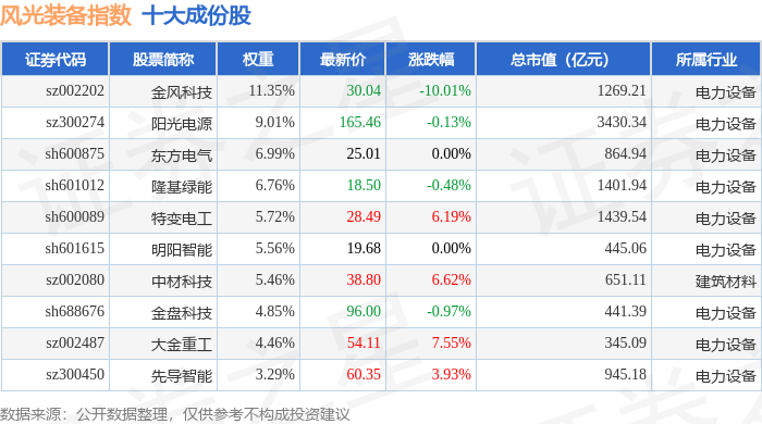 证券之星消息,1月15日,风光装备(980026)指数报收于1975.93点,跌0.69%,成交642.03亿元,换手率3.09%。当日该指数成份股中,上涨的有11家,海力风电以10.78%的涨幅领涨,下跌的有17家,金风科技以10.01%的跌幅领跌。