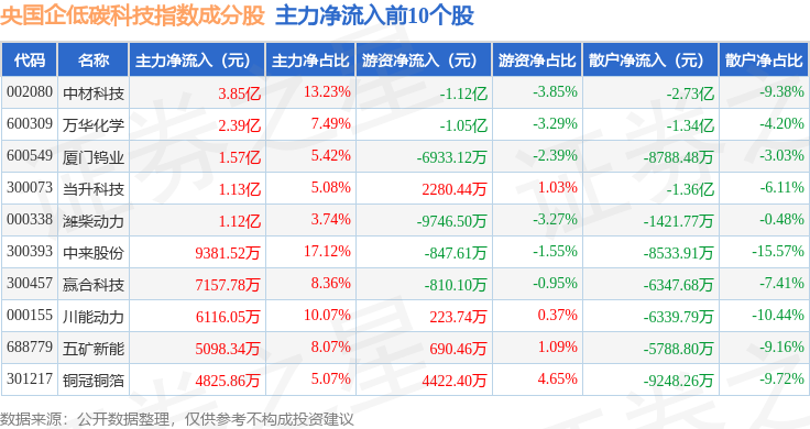 资金流向方面,央国企低碳科技(980082)指数成份股当日主力资金净流出合计15.61亿元,游资资金净流入合计7.47亿元,散户资金净流入合计8.15亿元。成份股资金流向详情见下表: