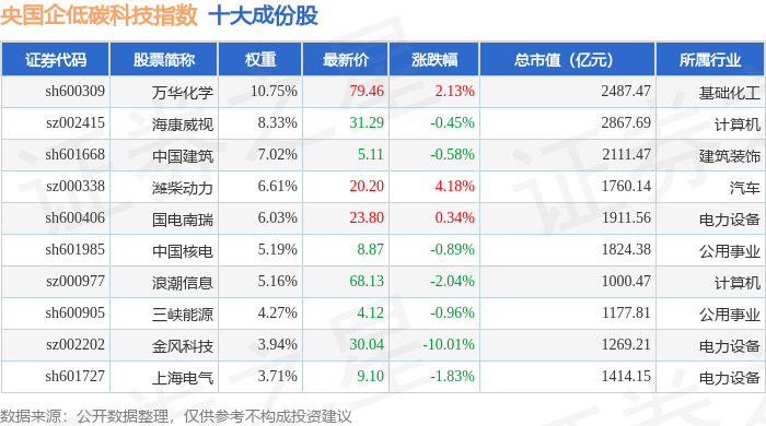 央国企低碳科技(980082)指数十大成份股详情如下:
