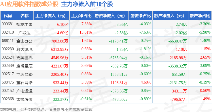 资金流向方面,AI应用软件(980107)指数成份股当日主力资金净流出合计116.64亿元,游资资金净流入合计18.61亿元,散户资金净流入合计98.03亿元。成份股资金流向详情见下表: