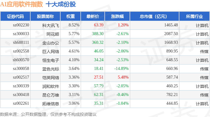 AI应用软件(980107)指数十大成份股详情如下: