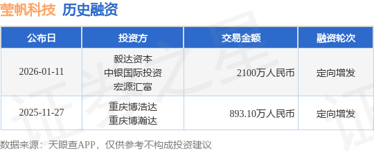 证券之星消息,根据天眼查APP于1月11日公布的信息整理,重庆莹帆科技股份有限公司定向增发融资,融资额2100万人民币,参与投资的机构包括毅达资本,中银国际投资,宏源汇富。