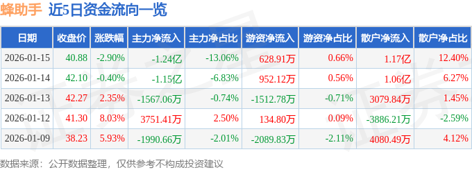 证券之星消息,截至2026年1月15日收盘,蜂助手(301382)报收于40.88元,下跌2.9%,换手率13.05%,成交量23.0万手,成交额9.46亿元。