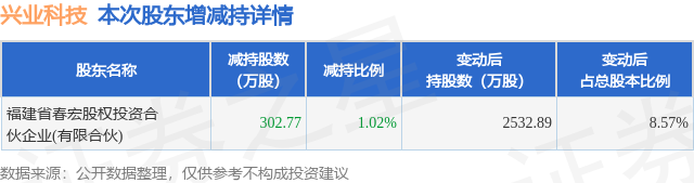 证券之星消息,1月15日兴业科技发布公告《兴业科技:关于持股5%以上股东减持股份超过1%的公告》,其股东福建省春宏股权投资合伙企业(有限合伙)于2025年12月30日至2026年1月14日间合计减持302.77万股,占公司目前总股本的1.0244%,变动期间该股股价上涨1.8%,截止1月14日收盘报15.23元。