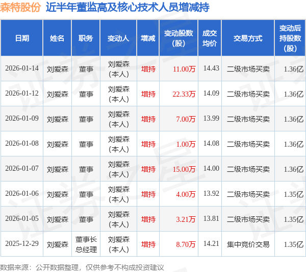 森特股份近半年内的董监高及核心技术人员增减持详情如下: