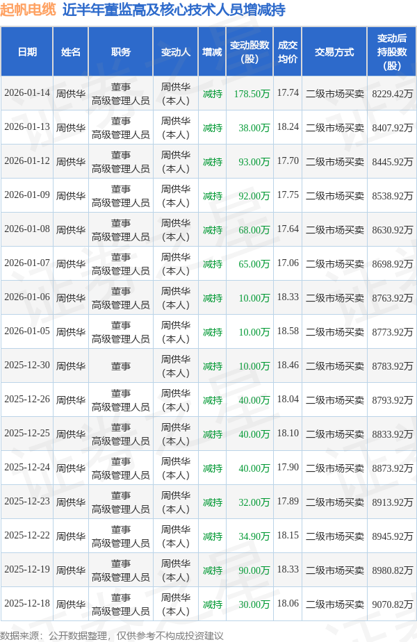 起帆电缆近半年内的董监高及核心技术人员增减持详情如下: