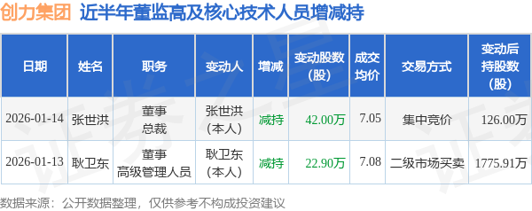 证券之星消息,根据1月15日市场公开信息、上市公司公告及交易所披露数据整理,创力集团(603012)最新董监高及相关人员股份变动情况:2026年1月13日公司董事,高级管理人员耿卫东共减持公司股份22.9万股,占公司总股本为0.0354%。变动期间公司股价下跌1.95%,1月13日当日收盘报7.03元。