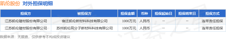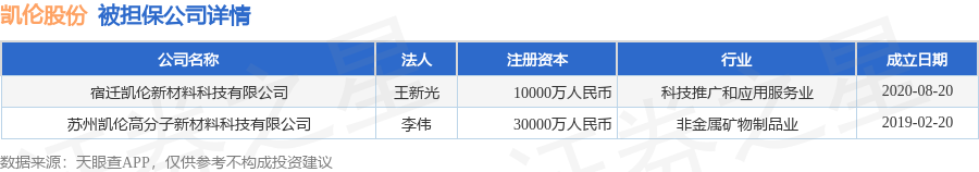 凯伦股份1月14日披露2笔对外担保,被担保公司2家。对外担保明细如下表: