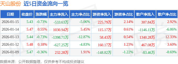证券之星消息,截至2026年1月15日收盘,天山股份(000877)报收于5.43元,下跌0.73%,换手率0.27%,成交量19.38万手,成交额1.05亿元。