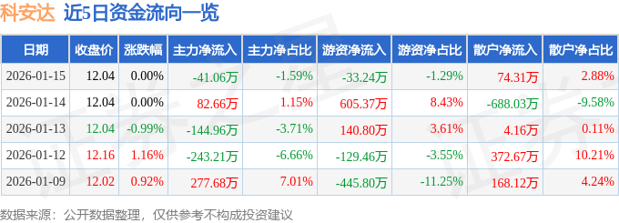 证券之星消息,截至2026年1月15日收盘,科安达(002972)报收于12.04元,上涨0.0%,换手率1.59%,成交量2.14万手,成交额2576.65万元。