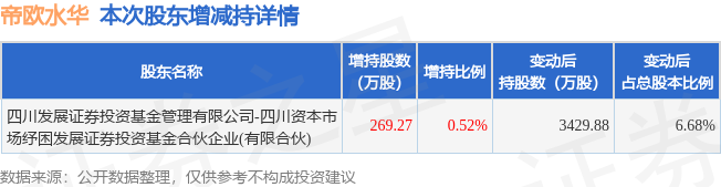 证券之星消息,1月15日帝欧水华发布公告《帝欧水华:关于公司持股5%以上股东增持计划实施完成的公告》,其股东四川发展证券投资基金管理有限公司-四川资本市场纾困发展证券投资基金合伙企业(有限合伙)于2026年1月13日至2026年1月14日间合计增持269.27万股,占公司目前总股本的0.5245%,变动期间该股股价上涨0.47%,截止1月14日收盘报6.46元。