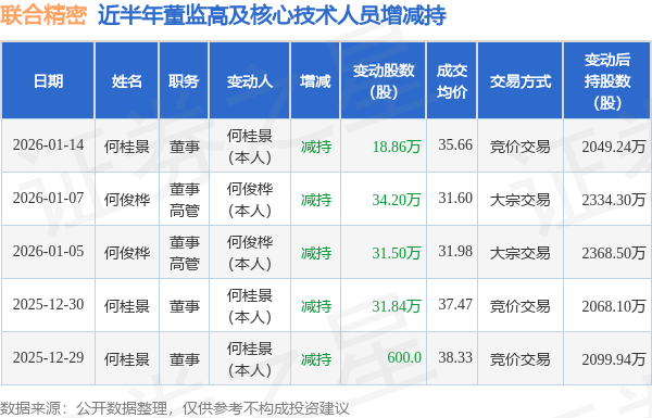 联合精密近半年内的董监高及核心技术人员增减持详情如下: