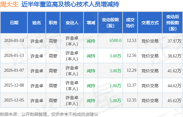 周大生近半年内的董监高及核心技术人员增减持详情如下: